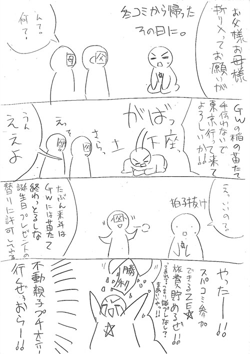 問題は田んぼ!!ということで、同居の両親に(実は隠れですんで、プチオンリーという事情は伏せて、あくまで知り合いの売り子という名目で)掛け合ってみました。
